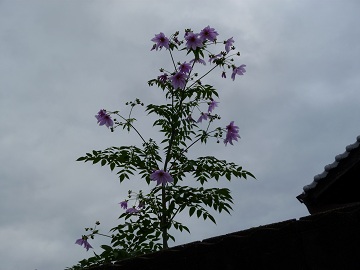 Posted on 2012-11-24 2022-09-02 by  Fu-san何んダ、こリゃア 塀越しにお隣の花をちょっと2コマ失礼して 塀の高さが1m50cm、その倍、ということは高さ3メートルの花 何、なんダ、こリゃア 近頃、よく見かける 「皇帝ダリア」とな! 背も高ければ、花もデカイ、さすが皇帝!