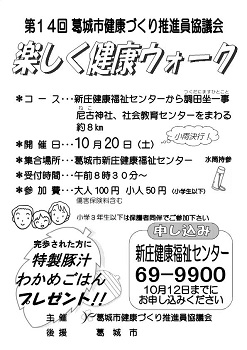 Posted on 2012-10-07 2022-07-30 by  Fu-san第14回「楽しく健康ウォーク」開催のお知らせ 昨年は、強雨のため残念ながら中止となりましたが、毎年秋に開催される、葛城市健康づくり推進員協議会による「楽しく健康ウォーク」ことしは、10月20日(土)に開催されますよ!